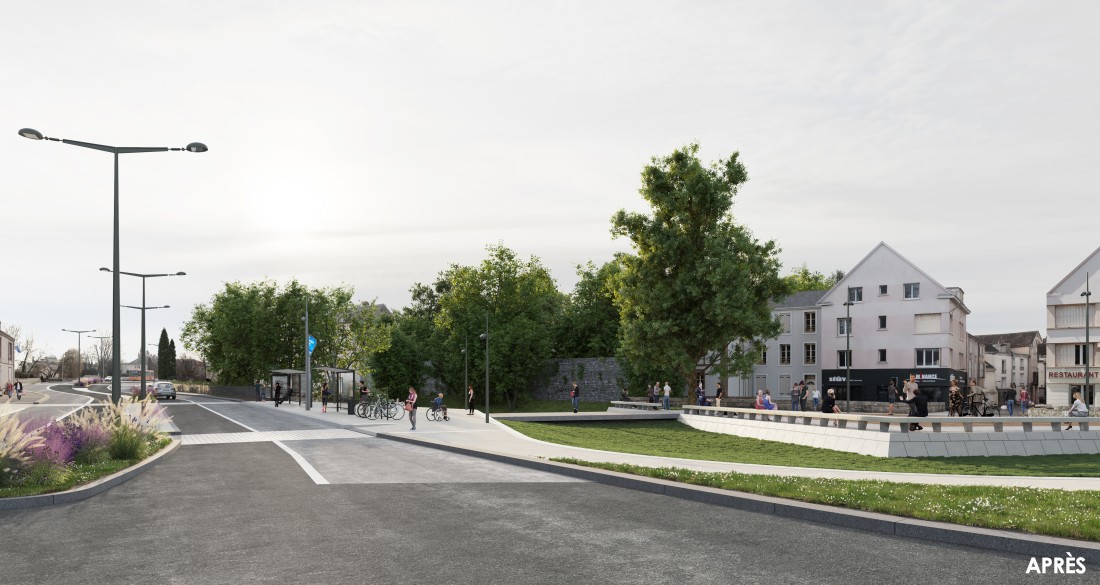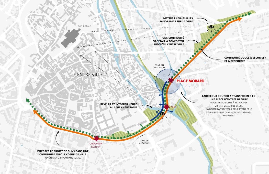 Sur la place Morard, il s’agissait de transformer l’actuel carrefour automobile en une «place urbaine», en s’appuyant sur l’histoire du lieu (ancien ouvrage bastionné) et le cadre paysager du site. L’aménagement propose une grande composition urbaine, guidée par son histoire, la présence de l’Eure et ses espaces paysagers, où la place de la voiture est réduite pour permettre une appropriation du lieu et de nouveaux usages : un nouveau lieu à vivre. Il sera le catalyseur d’un nouveau dynamisme de cette entrée de la ville basse et offrira, depuis la rue d’Ablis, une nouvelle image de Chartres.