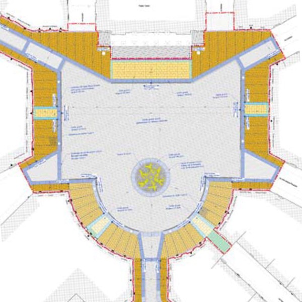 La priorité est donnée aux modes de circulation douce. La circulation automobile est restreinte mais toujours présente dans un premier temps. Des terrasses et contre-terrasses, sans mobilier fixe, sont réparties autour de la place. Pour les commerces n’ayant pas l’utilité de cet espace extérieur, des activités de type marché des livres ou antiquaires y prennent place. Les contre-terrasses maintiennent une promenade « lèche vitrine » le long des bâtiments.