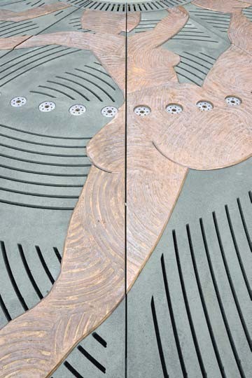 Le centre de la place est plongé dans une relative pénombre jusqu’à l’eau jaillissante et illuminée de la fontaine. Des œuvres d’artistes sont projetées sur le sol de la place.