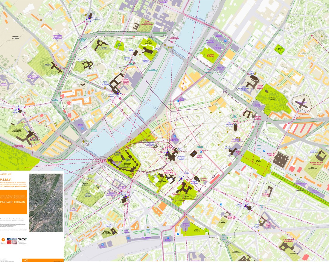 La ville d’Angers au riche passé historique présente un patrimoine urbain et architectural exceptionnel, protégé assez largement au titre des Monuments Historiques et par trois sites urbains inscrits de longue date. L’histoire et le paysage étant étroitement liés à Angers, l’étude s’est attachée non seulement au cœur historique et ses faubourgs mais aussi aux grands ensembles paysagers majeurs façonnés par La Maine. Le Diagnostic a porté, dans un premier temps, sur le volet patrimonial (évolution de la forme urbaine, approche des grandes spécificités de l’architecture angevine, analyse du paysage urbain), dans un second temps, sur les problématiques socio-économiques et de déplacements urbains pour lesquelles le regard sur les espaces publics est très présent.