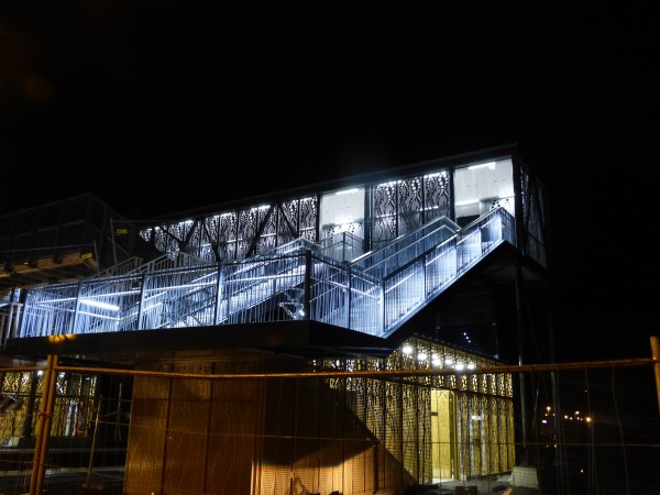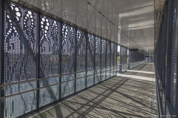 - Une distinction de couleur entre les parois des sas d’acier (couleur dorée) et de la passerelle (couleur alu) pour «alléger» l ‘architecture,