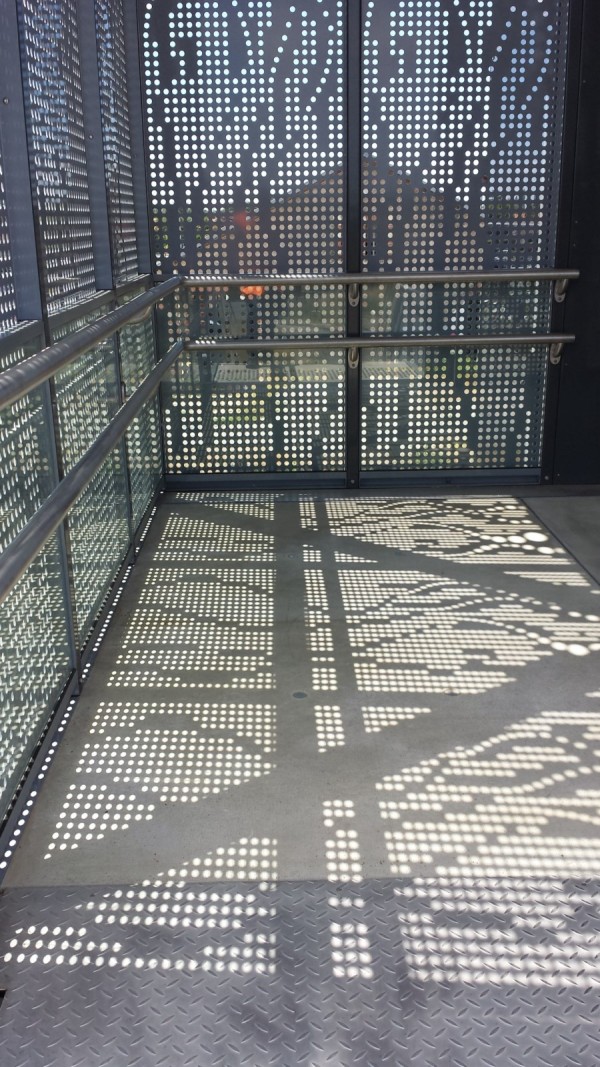- Les parois verticales réalisées en tôle perforée aux motifs verticaux suggérant les vapeurs des cheminées des anciennes locomotives,