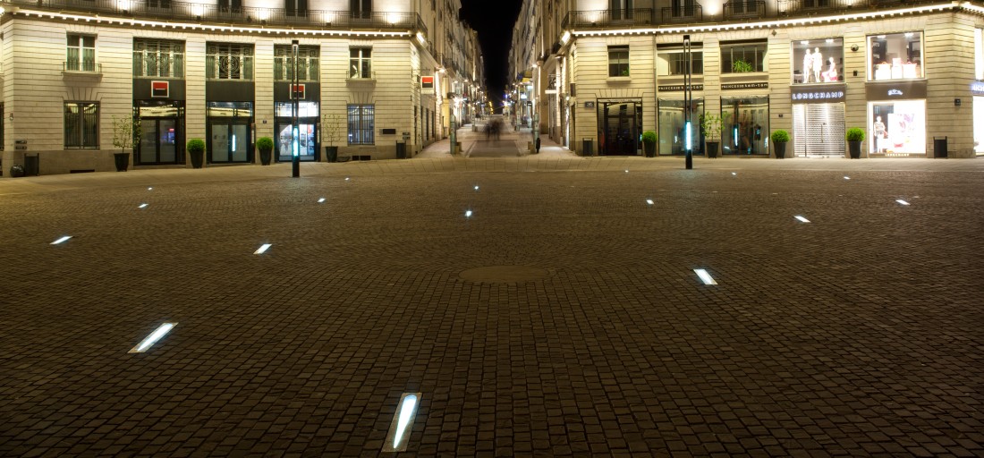 Des traits lumineux reprenant l’image d’eau projetée s’inscrivent dans le sol et rayonnent dans le pavage dans toutes les directions, de manière à renvoyer l’imaginaire des nantais au souvenir du rayonnement économique de leur cité grâce à la Loire et à son port.