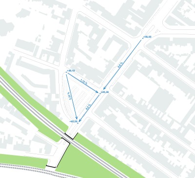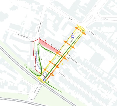 Le traitement s’étendra de façade a façade. Deux massifs et un habillage, en acier corten seront mis en œuvre pour marquer et symboliser l’ancienne porte, mettant en scène la traversée piétonne.