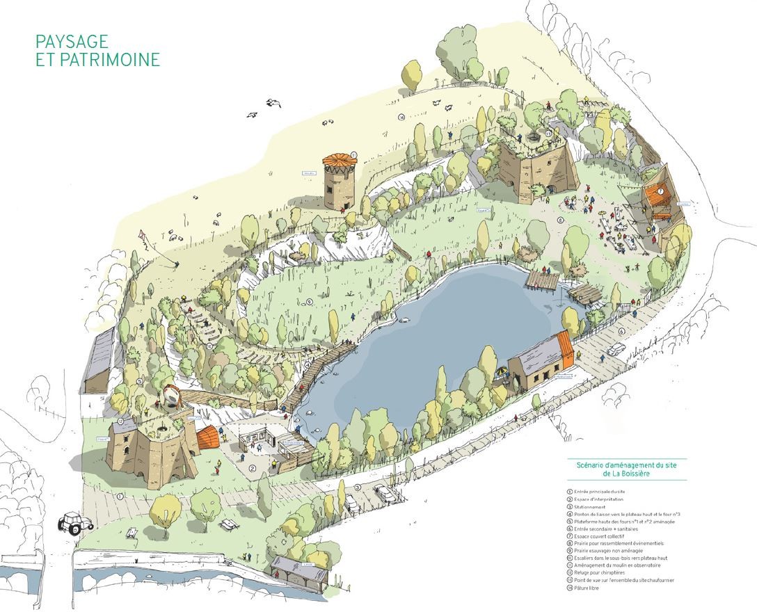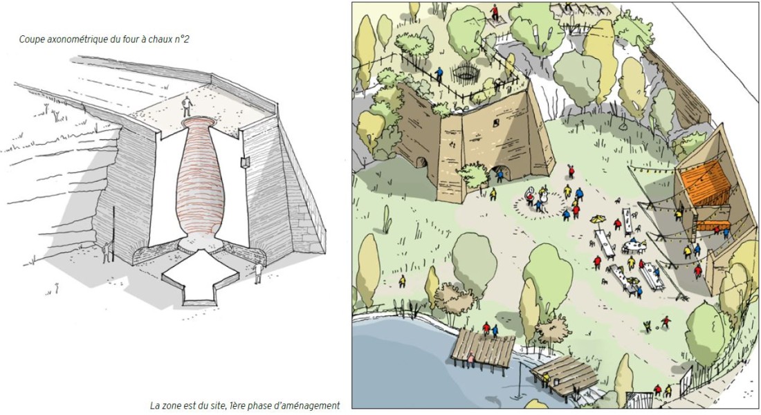 L’aménagement progressif du site prévoit ainsi : un espace de médiation, des pontons d’accès à l’eau, une aire de pique-nique, une zone événementielle et un belvédère…. proposant au visiteur de comprendre tout le processus de fabrication de la chaux, tout en conservant l’esthétique et l’ambiance empreint de romantisme de ces ruines paysagères exceptionnelles.