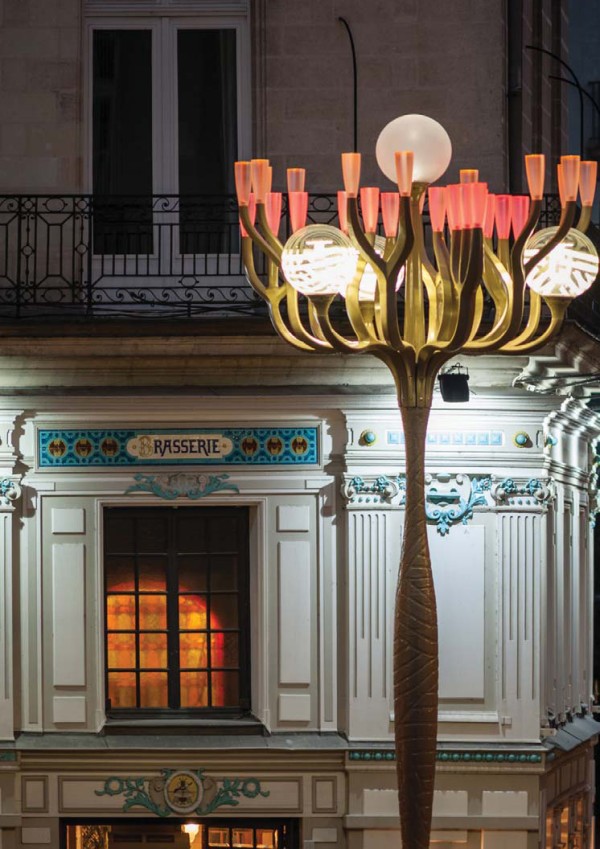 Le centre de la place est plongé dans une relative pénombre jusqu’à l’eau jaillissante et illuminée de la fontaine. Des œuvres d’artistes sont projetées sur le sol de la place.