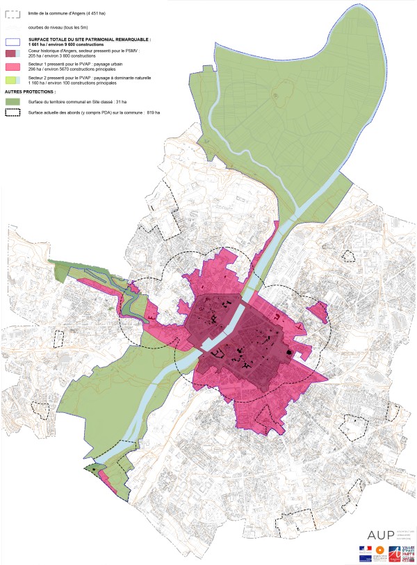 La ville d’Angers au riche passé historique présente un patrimoine urbain et architectural exceptionnel, protégé assez largement au titre des Monuments Historiques et par trois sites urbains inscrits de longue date. L’histoire et le paysage étant étroitement liés à Angers, l’étude s’est attachée non seulement au cœur historique et ses faubourgs mais aussi aux grands ensembles paysagers majeurs façonnés par La Maine. Le Diagnostic a porté, dans un premier temps, sur le volet patrimonial (évolution de la forme urbaine, approche des grandes spécificités de l’architecture angevine, analyse du paysage urbain), dans un second temps, sur les problématiques socio-économiques et de déplacements urbains pour lesquelles le regard sur les espaces publics est très présent.