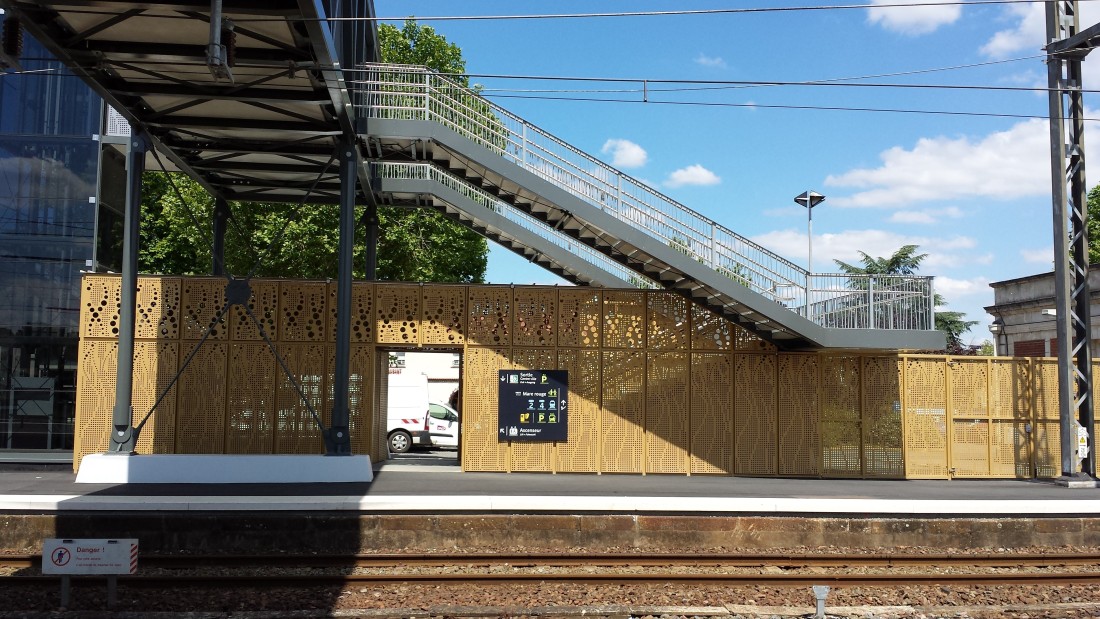 - Les parois verticales réalisées en tôle perforée aux motifs verticaux suggérant les vapeurs des cheminées des anciennes locomotives,