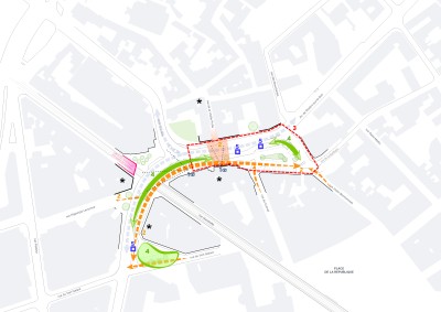 La composition de la place s’organise suivant axe Nord/Sud offrant des traversées visuelles et piétonnes, tout en intégrant le stationnement et reliant la place à l’Avenue de la Libération : une couture entre l’habitat, le stationnement et l’espace public. La place du Pâtis Saint Lazare retrouve dans son aménagement des porosités dans le traitement, des perméabilités de sols et des porosités visuelles. La place n’est plus seulement un lieu de stationnement, elle devient, par la création d’une bande active le long des façades d’habitations, un véritable lieu à vivre au quotidien. A l’écart du stationnement, séparée par un large massif planté, cette nouvelle bande piétonne permet de déployer de nouvelles activités de proximité tel qu’un espace libre récréatif, l’extension de la terrasse de café, une aire de repos avec du mobilier urbain adapté, un lieu accueillant et chaleureux. Cette bande active permet de redonner au site un caractère de place de quartier, de proximité, dans un esprit « village », un lieu de rencontre et de convivialité. Les ambiances végétales tout autour de la place laissent le regard libre sur l’horizon cadré par de nouvelles plantations d’arbres et densément plantée, avec un jeu d’arbustes, vivaces et graminées offrant ainsi une ambiance dynamique.