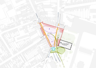 Le traitement s’étendra de façade a façade. Deux massifs et un habillage, en acier corten seront mis en œuvre pour marquer et symboliser l’ancienne porte, mettant en scène la traversée piétonne.
